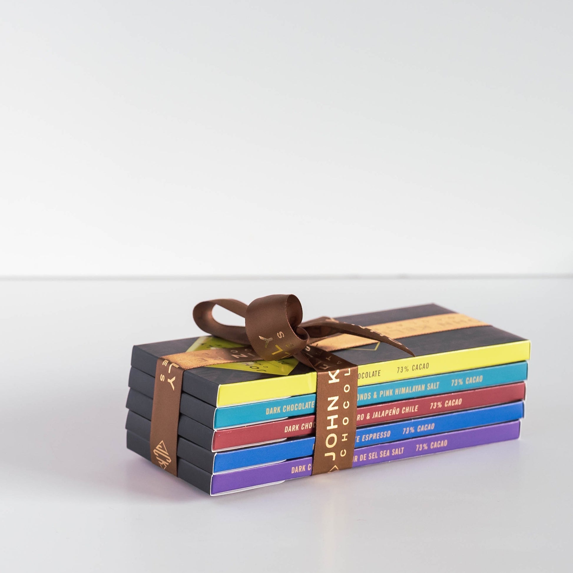 Five of our 73% cacao dark chocolate solid bars stacked with our signature ribbon. Vegan.